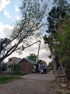 La sección de electricistas de la Municipalidad de Campo Quijano con la hidro grua y de la Delegación Municipal La Silleta se encuentran trabajando en las zonas de La Merced Chica y El Encón Grande, desde allí nos llegan estas imágenes.