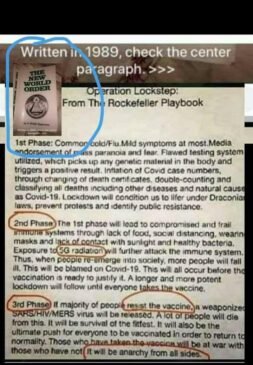 Primera fase: Resfriado común/gripe. Síntomas leves como mucho. El respaldo de los medios de comunicación causando paranoia y el miedo. Se utiliza un sistema de pruebas defectuoso, que recoge cualquier material genérico en el cuerpo y desencadena un resultado positivo. Inflación de los números de casos de Covid, a través del cambio de los certificados de defunción, el doble recuento y la clasificación de todas las muertes incluyendo otras enfermedades y causas naturales como Covid-19. El encierro nos condicionará a la vida bajo las leyes draconianas, evitará protestas e identificará la resistencia pública.