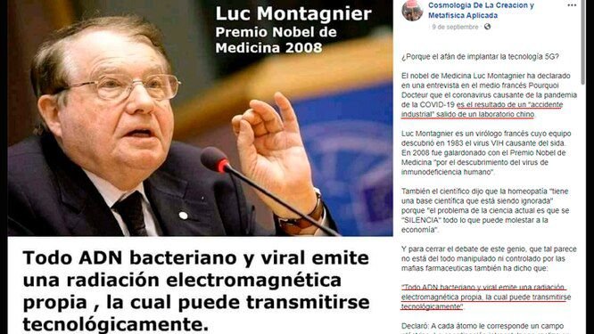 Una publicación de Facebook recoge declaraciones del premio nobel de medicina, Luc Montagnier, para sugerir que la propagación del nuevo coronavirus está vinculada a la tecnología 5G.