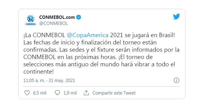 En un mensaje posterior, el organismo destacó: “¡Brasil recibirá a la CONMEBOL Copa América 2021! El mejor fútbol del mundo llevará alegría y pasión a millones de sudamericanos. La CONMEBOL agradece al presidente Jair Bolsonaro y su equipo, así como a la Confederación Brasileña de Fútbol por abrir las puertas de ese país al que es hoy en día el evento deportivo más seguro del mundo. ¡Sudamérica brillará en Brasil con todas sus estrellas!”