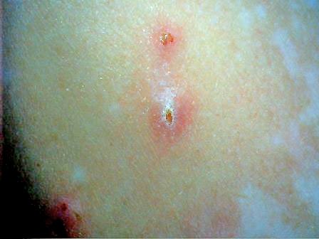 “Filamentos” dentro y sobre la piel y que en ocasiones pueden extraerse completas del interior de la piel. Los colores de las fibras suelen ser blancos, azules, rojos o negros, de tamaño microscópico, que para poder ser visualizados requiere microscopios de aumento 10-30 X. A veces se observan fluorescencias de esos filamentos, gránulos de tamaño de un grano de arena o sobre la piel o que aparecen entre la ropa.