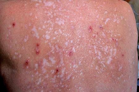 Las lesiones de la piel aparecen espontáneamente y suelen acarrear dolor o picor intenso, a veces estas heridas progresan en heridas abiertas que no se curan del todo o se curan muy lentamente dejando la epidermis decolorada o con una cubierta gelatinosa espesa.