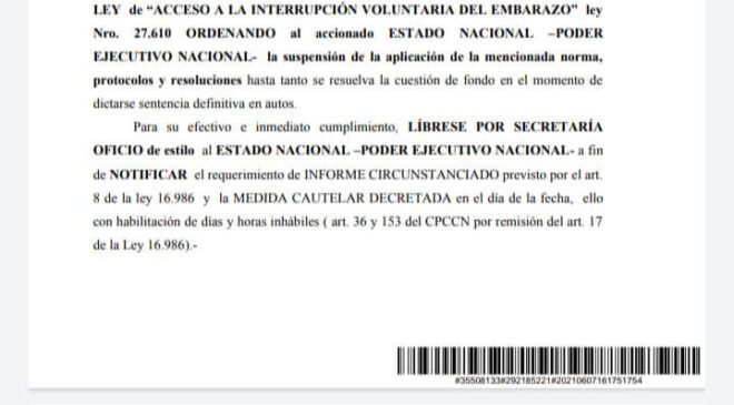 Manifiestan desde Marcha por la Vida y otras organizaciones que se movilizan por el derecho inalienable a la vida, que tuvieron una noticia alentadora más , ya que el Juzgado Federal N° 4 de Mar del Plata, PBA a cargo del Dr. Alfredo López en los autos “Seri, Hector Adolfo – Poder ejecutivo Nacional s/ Amparo ley 16.986” , con fecha del dia lunes 07 de junio de 2021 resolvió hacer lugar a la medida cautelar y ordenar la suspensión de la interrupción voluntaria del embarazo (IVE) ley 27.610 en todo el país hasta que se resuelva la cuestión de fondo en el amparo.