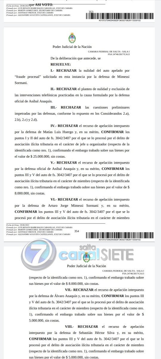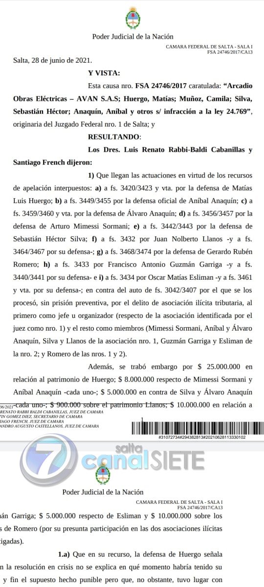 Los jueces de la Cámara Federal de Salta, Sala I, Luis Renato Rabbi-Baldi Cabanillas y Santiago French, rechazaron el recurso de apelación interpuesto por las defensas en la causa: “Arcadio Obras Eléctricas – AVAN S.A.S; Huergo, Matías; Muñoz, Camila; Silva, Sebastián Héctor; Anaquín, Aníbal y otros s/ por infracción a la ley 24.769”, originaria del Juzgado Federal nro. 1 de Salta.