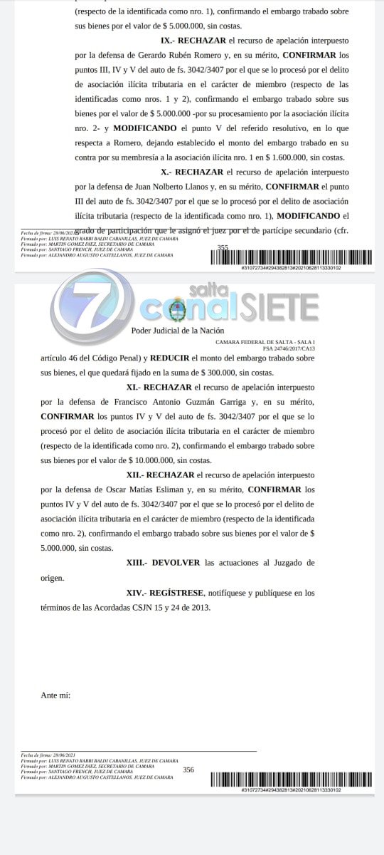 Además, los magistrados resolvieron trabar embargo por $ 25.000.000 en relación al patrimonio de Huergo; $ 8.000.000 respecto de Mimessi Sormani y Aníbal Anaquín -cada uno-; $ 5.000.000 en contra de Silva y Álvaro Anaquín -cada uno-; $ 900.000 sobre el patrimonio Llanos; $ 10.000.000 en relación a Guzmán Garriga; $ 5.000.000 respecto de Esliman y $ 10.000.000 sobre los bienes de Romero (por su presunta participación en las dos asociaciones ilícitas investigadas).