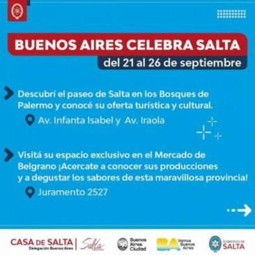 Durante las fechas mencionadas, Salta estará presente con acciones al consumidor final en los Bosques de Palermo, donde se realizarán juegos interactivos, entrega de merchandising e información del Destino, música, baile, sorteos en vivo, entre otras acciones.
