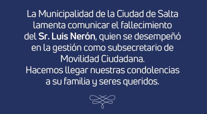 En la tarde de hoy la Municipalidad de Salta dio a conocer la triste noticia del fallecimiento del señor Luis Nerón quien se desempeñaba como Subsecretario de Movilidad Ciudadana, además la Municipalidad de Salta hizo pública sus condolencias y el acompañamiento a sus familiares.