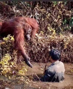La imagen muestra a un orangután que actualmente está en peligro de extinción mientras extiende la mano para ayudar a un geólogo que cayó en una piscina de barro durante su búsqueda, una escena conmovedora.