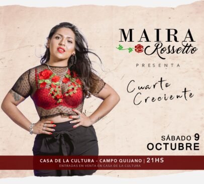 Este 9 de Octubre, se invita al público salteño a disfrutar del primer concierto ‘Cuarto Creciente’, de la artista Maira Rossetto, en la Casa de la Cultura de Campo Quijano. Duran el desarrollo del evento, se recorrerá un repertorio amplio con una banda extraordinaria.