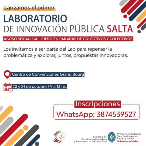 La Secretaría de Participación Ciudadana y Relaciones con la Comunidad lanzará el primer Laboratorio de Innovación Pública de Salta. En dos encuentros, se pensará sobre acoso sexual callejero en paradas de colectivos y colectivos, y se buscará, a través del análisis y debate ciudadano, obtener propuestas creativas a dicha problemática.
