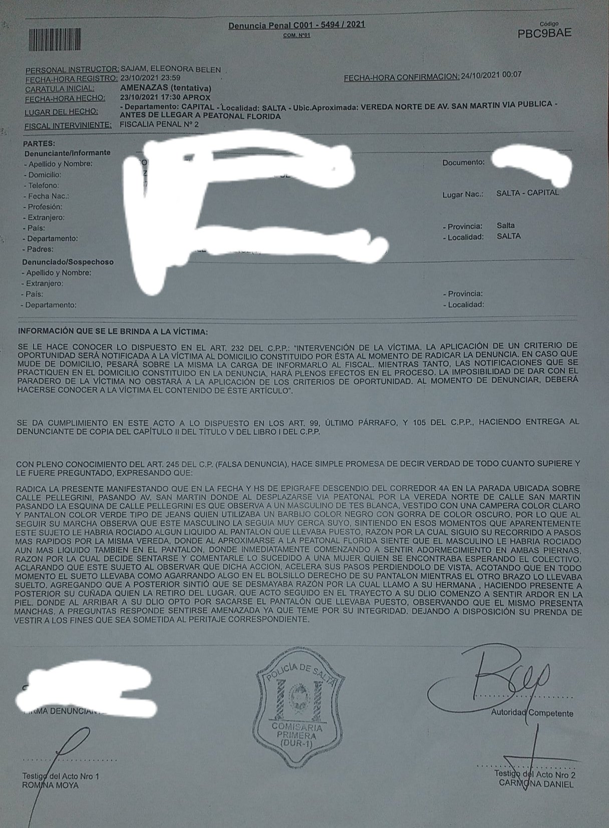 Al bajarme del cole en la calle Pellegrini, me dirigí hacia la calle San Martin y en la esquina vi a un chico parado afuera de un local el cual me empezó a seguir, sentí que me roció algún líquido al pantalón y al mirar en una vidriera me di cuenta que el chico venía por detrás mío. Por lo cual decidí caminar mas rápido, al aproximarme a la peatonal Florida sentí que me volvieron a rociar aún más líquido, donde inmediatamente comencé a sentir adormecimiento en ambas piernas, razón por la cual al mirar hacia mi izquierda vi a una chica sentada y me senté a su lado para pedirle ayuda. El al ver que estaba hablando con la chica, acelero su paso hasta perderlo de vista. En el momento que le estaba contando lo sucedido a la chica sentí que me iba a desmayar y tuve que llamar a mi hermana y cuñada (Jimena).