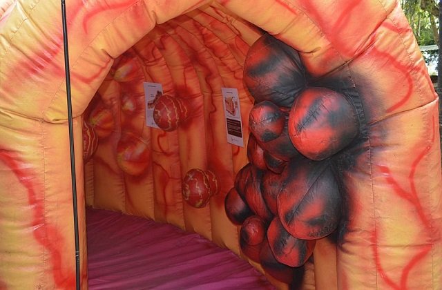 La muestra, que contó con el apoyo del Área de Oncología de Merck, compañía alemana de ciencia y tecnología, cuenta con monitores que proyectan videos y está compuesta por un colon inflable gigante dispuesto en forma de túnel, al que las personas pueden ingresar y recorrer mientras se informan acerca de los distintos estadios de la enfermedad, la importancia de la detección precoz y las alternativas de estudios diagnósticos.