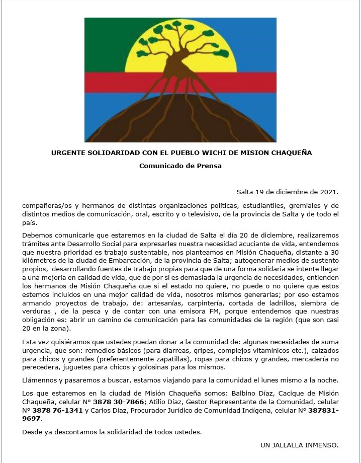 Salta – Es necesario urgente la solidaridad con el pueblo wichí de Misión Chaqueña 20 diciembre, 2021