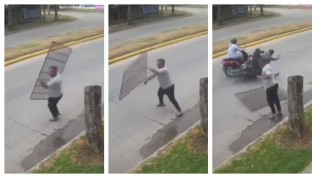 Según se puede ver en las imágenes, el hombre se encontraba retirando las rejas del frente del comercio cuando vio que se aproximaban dos presuntos motochorros que perseguían supustamente a un motociclista para robarle. Ante esa situación, con una de las planchas de metal en la mano, esperó que se acercaran del todo y arrojó la reja directo a las ruedas de una de las motos para deternos.