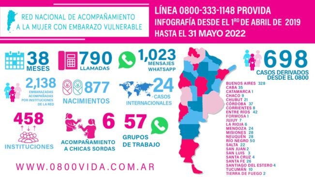 La Red Nacional de Acompañamiento a la Mujer, cuenta en la actualidad con más de 400 instituciones voluntarias de todo el país, las cuales asisten a la mujer embarazada que solicita ayuda desde cualquier parte de Argentina, a través de una línea telefónica nacional gratuita 0800 333 1148.