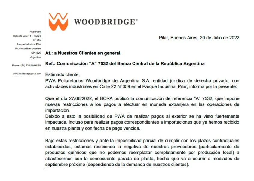 La compañía, que fabrica apoyacabezas, apoyabrazos y espumas de poliuretano utilizadas en el interior de los automóviles, es proveedora de la mayoría de las terminales automotrices que producen en la Argentina desde su planta ubicada en el Parque Industrial Pilar. En la carta que envió hoy a sus clientes, a la que accedió Infobae, puntualizó que la comunicación A7532 del Banco Central, que a fines de junio dispuso más restricciones para el pago de importaciones, limitó al máximo su posibilidad de cumplir con sus compromisos con el exterior, “incluso para realizar pagos correspondientes a importaciones que ya hemos recibido en nuestra planta y con fecha de pago vencida.”