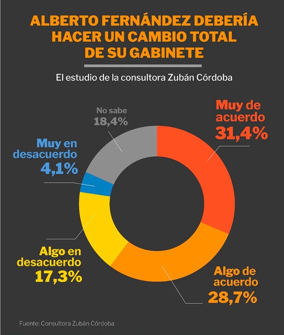 “Una inmensa mayoría cree que es importante que el gobierno termine su mandato. La sociedad muestra un importante respeto por las instituciones que quizás los medios y la política no. Sin embargo, esa misma sociedad cree que el Presidente debería hacer un cambio total de su gabinete. La versión circula por estas horas en todos los pasillos de la política”, explicaron desde la consultora a través de las redes sociales.