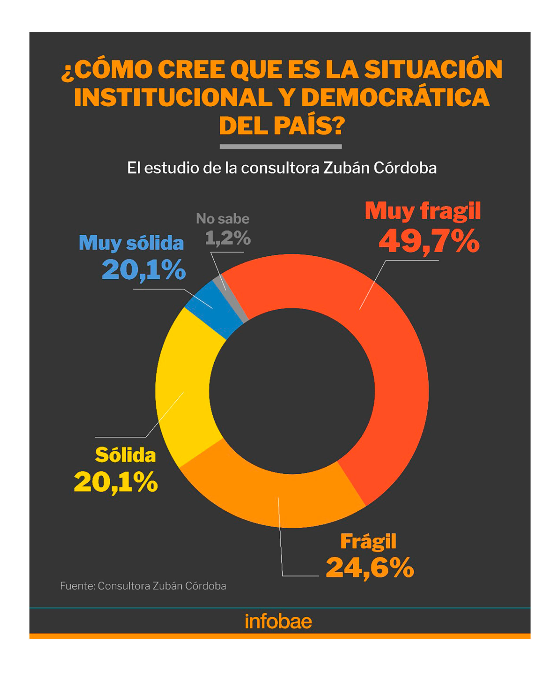 El estudio fue realizado por la consultora Zubán Córdoba. Además, para un 74% de los consultados la situación institucional y democrática del país “es muy frágil”