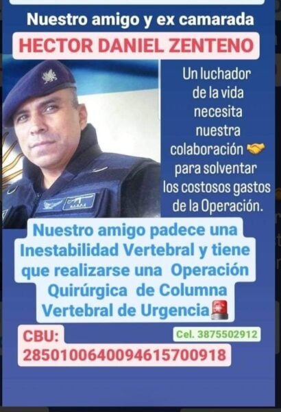 Héctor Daniel Zenteno, quien se desempeña en las fuerzas de seguridad de la provincia, necesita de manera urgente y rápida una prótesis para que lo operen quirúrgicamente de la columna, ya que posee inestabilidad vertebral.