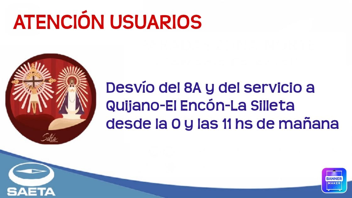 Está noche desde la 0 hora y hasta las 11 hs de mañana miércoles 14, SAETA dispondrá el desvío de sus líneas 8A y del servicio a Quijano- El Encón -La Silleta. El Nuevo recorrido fue trazado en razón de dar continuidad al itinerario de ambas líneas frente al corte del tránsito vehicular que se establecerá para recibir a los peregrinos de la Puna y la Quebrada del Toro y ofrecerles el típico desayuno.