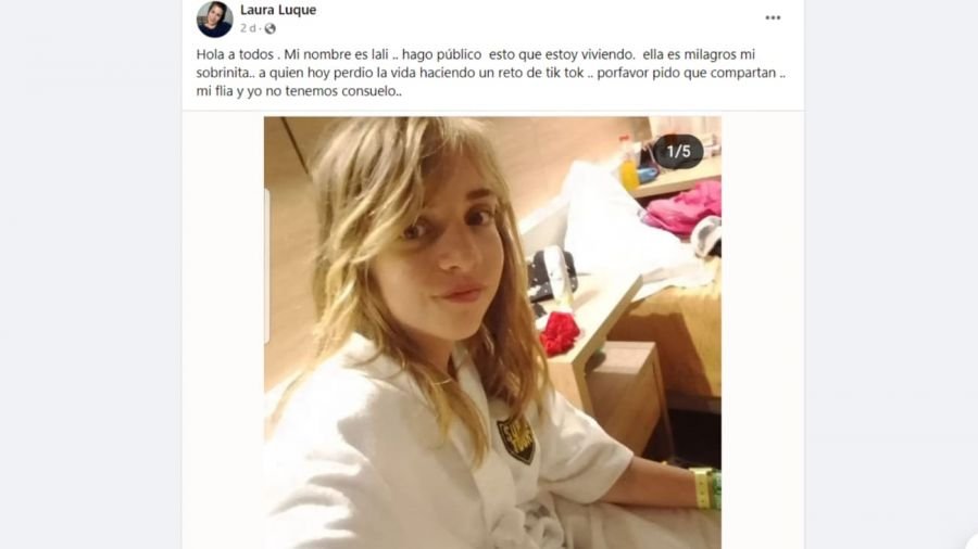 “Hola a todos. Mi nombre es Lali. Hago público esto que estoy viviendo. Ella es Milagros (en referencia a una foto que acompaña el posteo), mi sobrinita, quien hoy (por el último viernes) perdió la vida haciendo un reto de TikTok. Por favor pido que compartan. Mi familia y yo no tenemos consuelo”, publicó la mujer junto con una foto de la niña.
