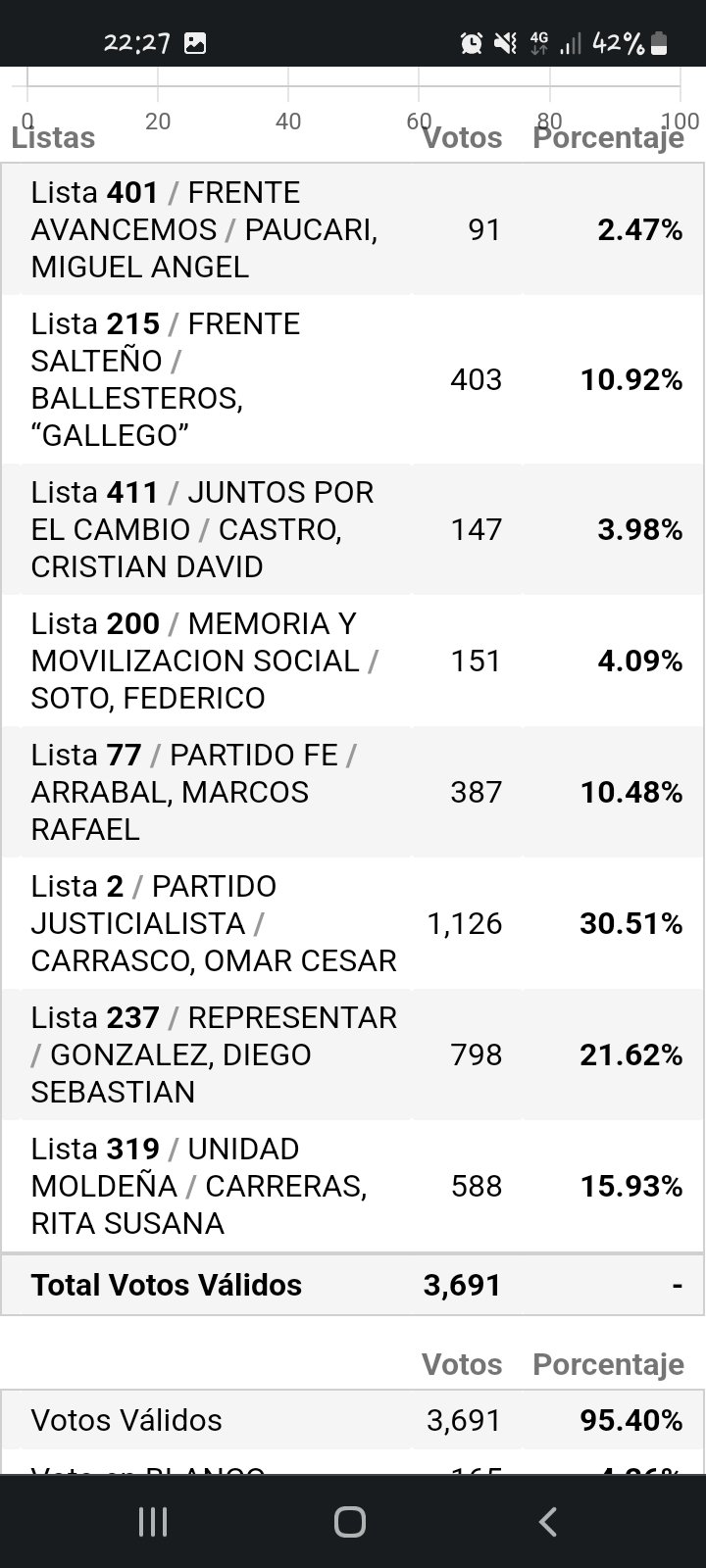 Luego de escrutadas el 100% de mesas el actual intendente de la localidad de Coronel Moldes se impuso con un 30, 51% de votos. Omar Cesar Carrasco por el partido justicialista se colocó en primer lugar asi obteniendo nuevamente el triunfo.