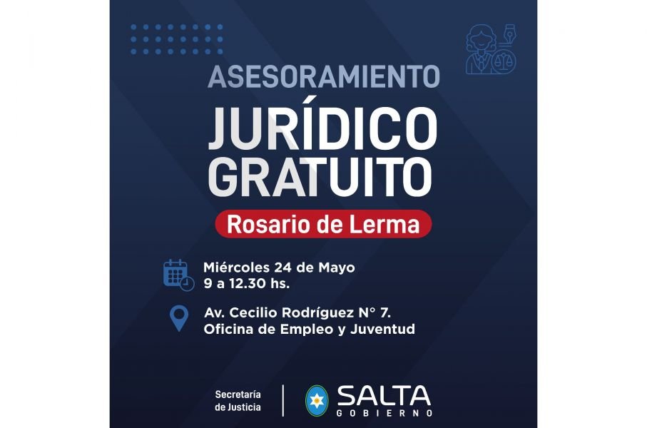 El Ministerio de Seguridad y Justicia, a través de la Secretaría de Justicia, brindará asesoramiento jurídico gratuito a vecinas y vecinos de Rosario de Lerma. Será a través del programa “La Justicia Junto a Vos”.