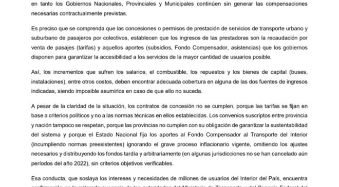 La FATAP (Federación Argentina de Transporte Automotor de Pasajeros, emitió un comunicado en el que destacan “la imposibilidad de negociar un acuerdo salarial”. Solicitaron al Gobierno, emitir acciones concretas para garantizar la normal prestación del servicio y no a afectar a cientos de usuarios.