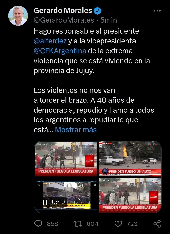 Hace instante y a través de sus redes el gobernador jujeño responsabilizó al Presidente de la Nación por los hechos lamentables de violencia en contra de los ciudadanos en su provincia.