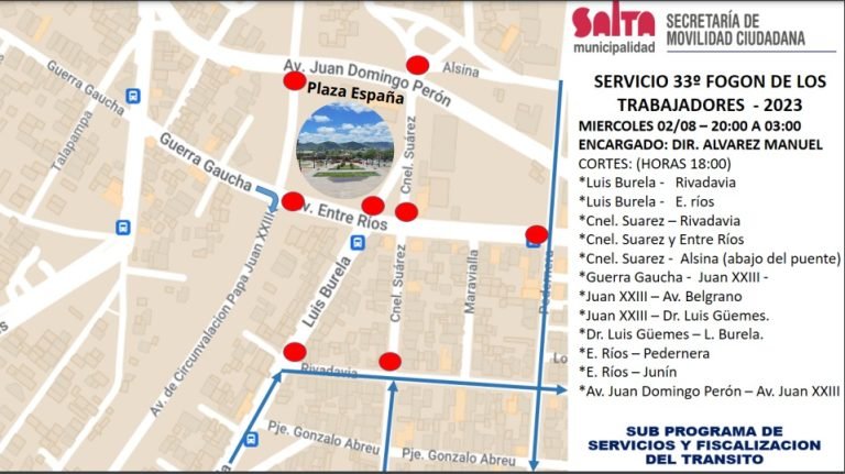 La Municipalidad implementará un amplio dispositivo de seguridad vial e implantará controles con motivo de realizarse el 33° Fogón de los Trabajadores, festival folclórico en honor a San Cayetano, que se desarrollará mañana en el anfiteatro e instalaciones de la plaza España, en zona oeste.