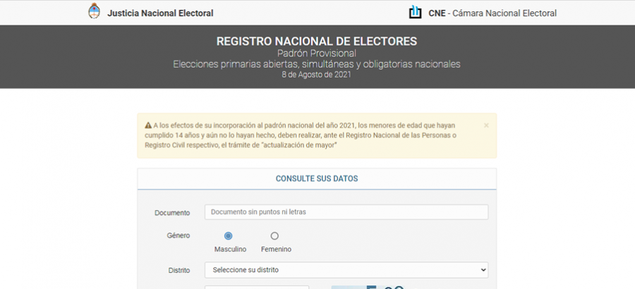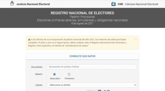 La Cámara Nacional Electoral dio a conocer el Padrón Electoral Definitivo. Se podrá consultar los datos de lugar y mesa de votación previstos para las primarias del domingo 13 de agosto.