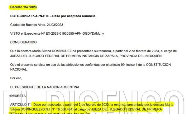 Tras la feria judicial, el gobierno nacional oficializó la renuncia de Domínguez el pasado 22 de marzo de 2023 en el Boletín Oficial. La norma lleva la firma de Soria.