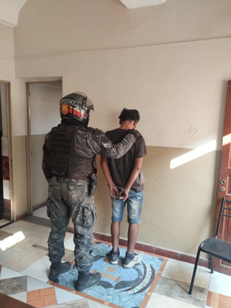Por la situación se recomendó a los móviles y patrullas en circulación la ubicación de los mismos. A los pocos minutos la patrulla Motorizada demoro de uno de los sospechosos, tratándose de un hombre de 41 años, quien llevaba una batería de automóvil y un elemento de metal, elementos que no pudo justificar su procedencia.