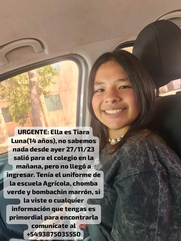 Al momento de la desaparición Tiara vestía una chomba verde y bombachín marrón. Ante cualquier información sobre el paradero de la joven comunicarse al Sistema de Emergencias 911 o al 03875035550.