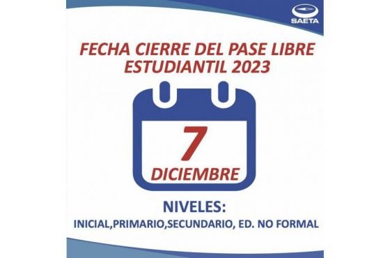 SAETA informa a sus usuarios que hoy jueves 7 de diciembre, finalizará la vigencia del Pase Libre Estudiantil para los niveles inicial, primario, secundario y de educación no formal.