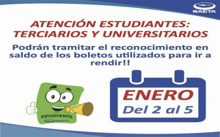 SAETA informa a los estudiantes terciarios y universitarios que rindieron exámenes fuera del período de vigencia del Pase Libre Estudiantil, que del martes 2 al viernes 5 de enero inclusive podrán solicitar el reconocimiento en saldo de los pasajes empleados para concurrir a la cita evaluadora.