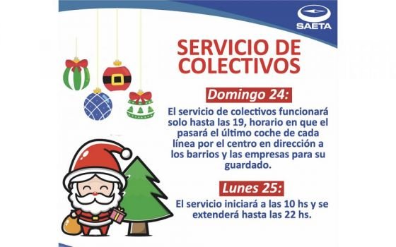 SAETA informa a sus usuarios que el domingo 31 de diciembre el servicio de colectivos funcionará solo hasta las 19, horario en que el pasará el último coche de cada línea por el centro en dirección a los barrios y las empresas para su guardado.
