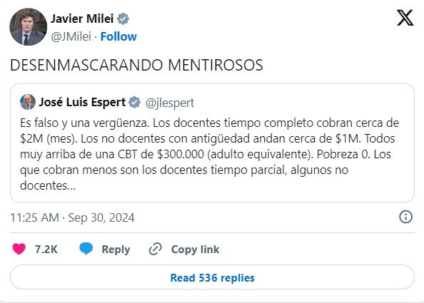 Ante un escenario de conflictividad creciente, el presidente Milei no hizo más que echar nafta al fuego desde su cuenta de Twitter: se pasó el día retuiteando insultos a las universidades y reclamos de auditorías. En unos de sus mensajes tituló: “DESENMASCARANDO MENTIROSOS”. Lo que compartía era un mensaje de José Luis Espert quien arguyó que en las universidades “los docentes tiempo completo cobran cerca de $2M (mes). Los no docentes con antigüedad andan cerca de $1M. Todos muy arriba de una CBT de $300.000 (adulto equivalente). Pobreza 0. Los que cobran menos son los docentes tiempo parcial, algunos no docentes y $0 los ad honorem (escándalo). Muestren los datos”. Son las mismas cuentas con las que los jubilados cobran “el triple en dólares”