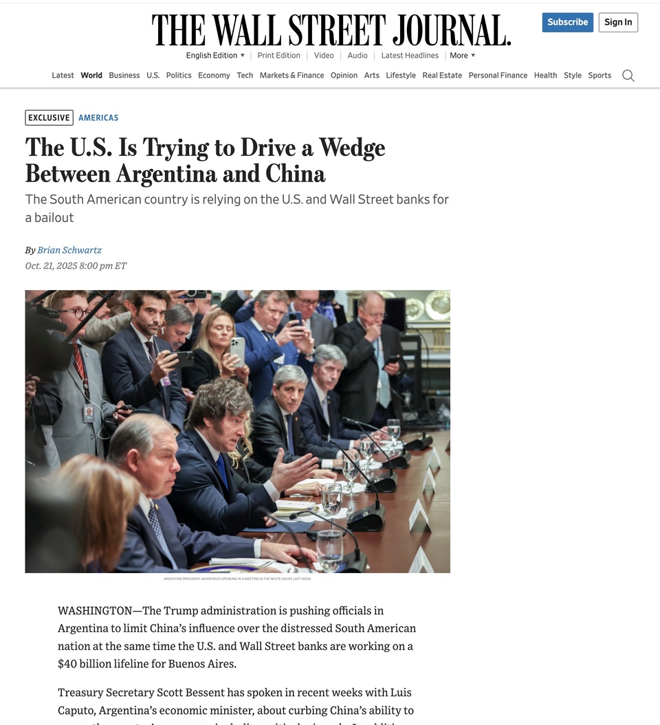 “Estabilizar a la Argentina es ‘América primero’”, sostuvo un portavoz del Tesoro citado por el WSJ, al remarcar la importancia geopolítica que Washington otorga al país en el contexto de las tensiones comerciales con Pekín.