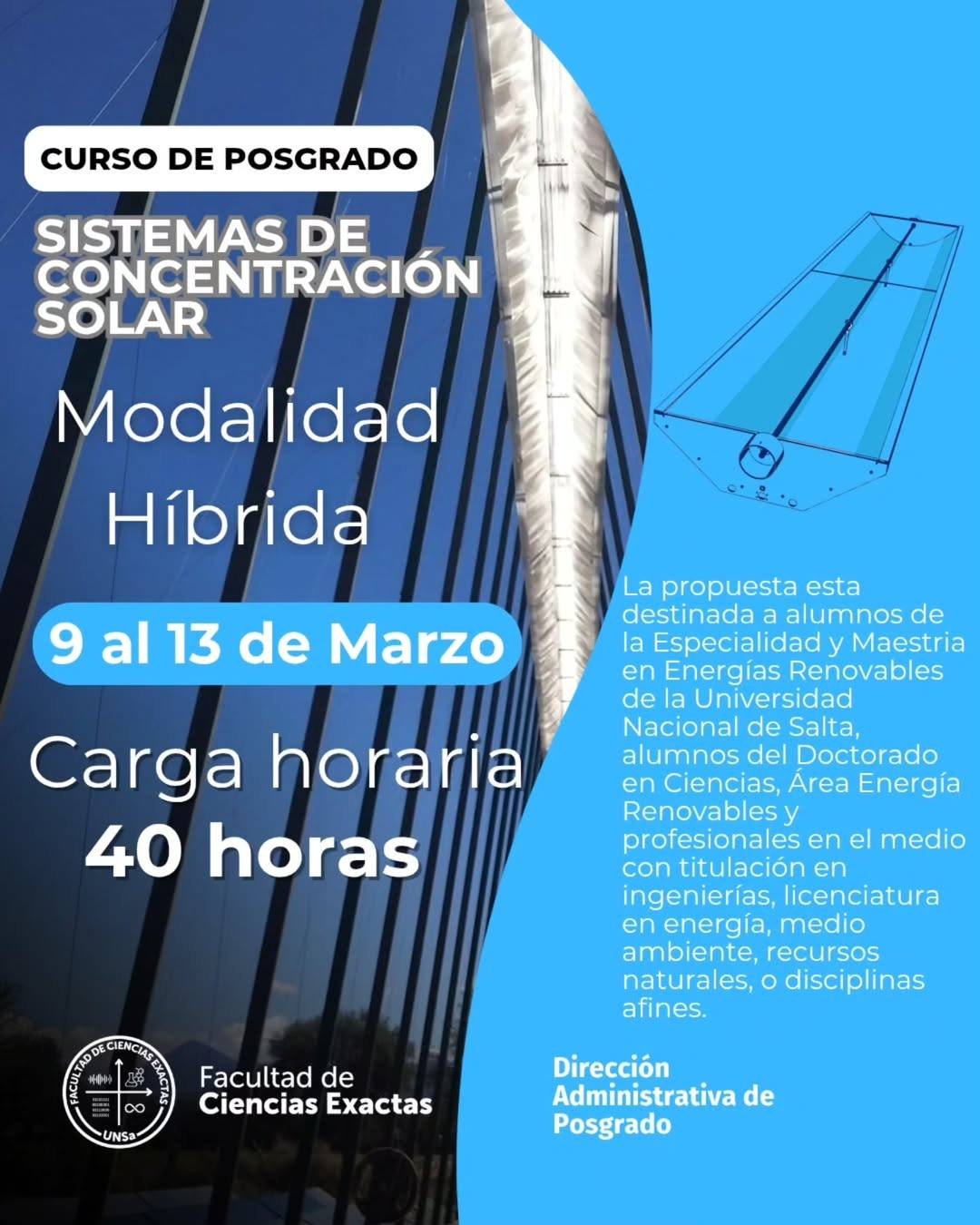 La Facultad de Ciencias Exactas informa que continúan abiertas las inscripciones para el Curso de Posgrado en “Sistemas de Concentración Solar” con orientación en Energía Solar Térmica. El cursado se desarrollara entre el 9 al 13 de marzo.