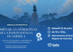 La Municipalidad de Salta, a través de la Agencia de Cultura Activa, organiza el segundo Desfile Cívico Militar Femenino en conmemoración del Día de las Heroínas y Mártires de la Independencia de América. El acto tendrá lugar el sábado 12 de julio, a partir de las 10:00 h, en las inmediaciones del Monumento al General Güemes. Cronograma y participantes 10:00 h: Inicio...