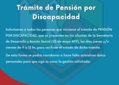 Desde la Municipalidad de Campo Quijano, solicitan a todas las personas que iniciaron el trámite de PENSIÓN POR DISCAPACIDAD, que se presenten en las oficinas de la Secretaría de Desarrollo y Acción Social (25 de mayo 499), los días jueves y/o viernes de 9 a 12 hs. para verificar el estado de dicho trámite. De esta forma se podrá corroborar...