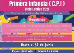 La Secretaria de Desarrollo y Acción Social informa que se abrieron 23 cupos para el Centro de Desarrollo Infantil de barrio San Jorge, para incorporar niños de entre 2 a 4 años. La convocatoria esta destinada a niños y niñas de los barrios aledaños como San Jorge, San Roque y Valle Encantado. Como único requisito se debe presentar DNI del...