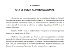 Leer Mas...La UTA confirmó que se adhiere al paro nacional del 9 de mayo